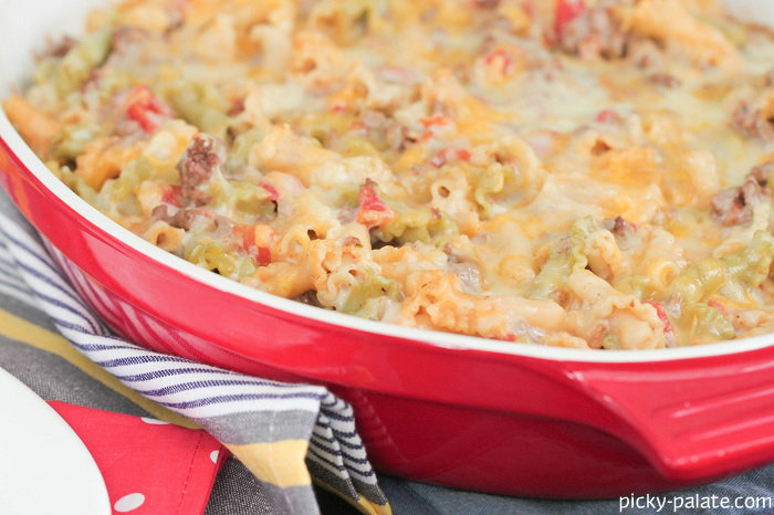 5. Transfer beef, noodles and queso to a large pot or Dutch oven over medium low heat. Taste and season with additional salt and pepper to your liking. Transfer to prepared baking dish and top with shredded cheese. Bake for 25-30 minutes until cheese is melted. Serve warm.
